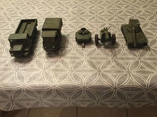 Lot d'anciens véhicules militaires soit - 1 Berliet Gazelle Dinky Toy's Meccano (824) - 1 Renault 4X4 Solido - 1 Cuisine roulante Marion Dinky Toy's Meccano (823) - 1 Char AM