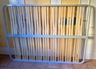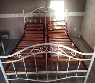 Je vends ce lit en métal blanc avec sommier à lattes. - Type de produit : Lit 190 x 140 - Matériau : Métal blanc - Sommier double : Lattes en bois inclinaison ajustable au nivea