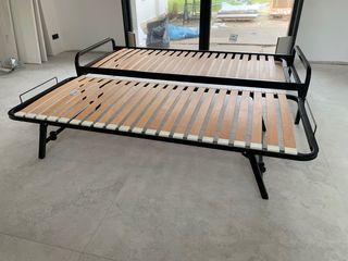 Très peu servis, lits gigogne largeur 80 cm , structure métallique laquée noir , sommiers en lattes de bois, lit escamotable avec pieds rabattables équipés de roulettes. Matelas