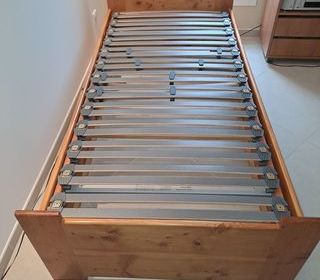 Lit 90x190 démontable: - en cèdre massif pleine planche (fabrication artisanale) très bon état - sommier Pirelli à lattes excellent état, - matelas Pirelli et linge de lit offer