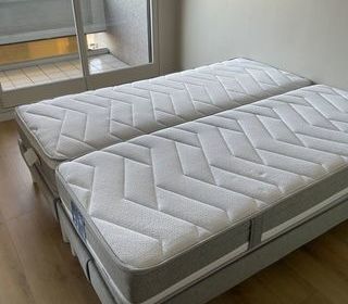 Cause déménagement : à vendre 2 x 1 lit 1 place en très bon état Matelas Viena Senzo 80x200 Sommier tapissier 80x200 finition MO93 Pieds blancs h : 20 cm Prix achat : 1700 €