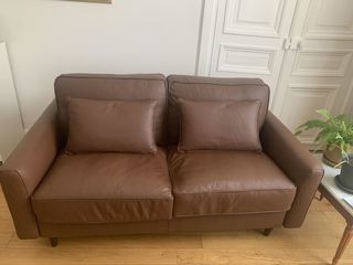Canapé cuir convertible couchage 120x196 Sommier à lattes larges en bois Matelas 12/13cm Revêtement cuir marron Pieds Wengé - accoudoirs 10cm L162xP98xH85 Ce canapé m'a été