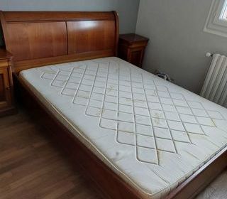Lit et sommier tapissier à lattes en bon état. Matelas à ressorts ensachés (quelques taches). 2 chevets en bon état.
