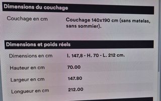Lit de 140 cm X1,90 cm. Son état est impeccable et très bien entretenu. Aucune griffe ni éraflure. 1 double sommier à lattes.