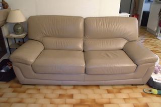 Canapé 3 places convertible (212x92x96) - Cuir vachette fleur corrigée pigmentée - Coloris beige - structure sapin, piètement wenge - assise mousse polyuréthane - Sommier à lattes