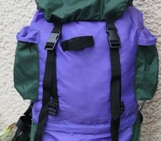 Sac à dos pour scout, vert/violet, 60 cm de hauteur, 90 cm de tour, 2 compartiments séparés, 1 poche dans le rabat supérieur, 2 poches fermées par zip sur les côtés, bretelles conf