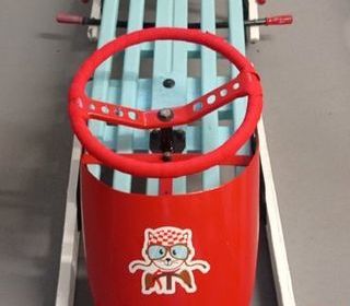 luge en bois pouvant porter jusqu'à trois enfants avec gros frein arrière, carénée avec volant direction, restaurée entièrement en 2023 prix 180€ a prendre sur place à coté d'Oloro