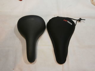 Couvre selle de la marque"GELTECH" et la selle et de la marque"SELLE ROYAL". Dimensions de la selle: 28 sur 17 cm. Sur la selle à l'arrière il y a 2 trous de fixation pour un s