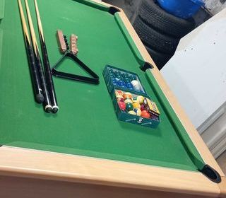 Bonjour, je mets en vente mon billard : -la plaque est en ardoise -dimensions 2.10à -1,20m -3 queues de billard -boules pour 8 pool verte et bleue - boules numérotées -tri