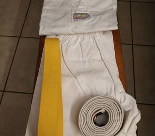 Vends Kimono de taekwondo T2, stature 150 cm. Comme neuf, servi 1 fois !!! Une ceinture blanche et une ceinture jaune en prime.