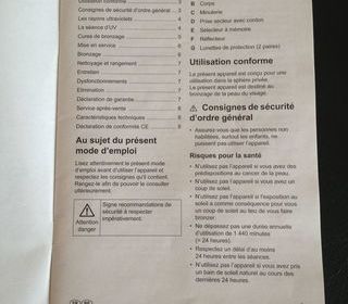 Je propose (cause double emploi) un SOLARIUM pour visage et décolleté, muni d'un sélecteur à mémoire (pour chaque type de peau), ainsi qu'un minuteur incorporé. Le mode d'emploi f
