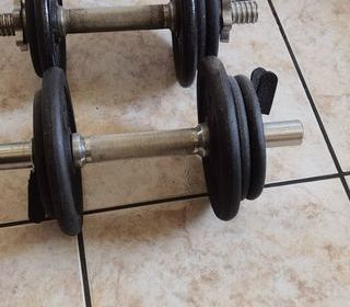 Ensemble complet d'haltères, 2 barres et colliers de serrage 6 disques de 1kg, 4 disques de 2kg, en bon état, vente cause déménagement, à venir récupérer sur place. Possible