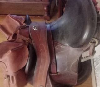 Selle d'équitation australienne complète équipée randonnée 6 anneaux étriers sous ventriere tapis de selle fontes avant bon état