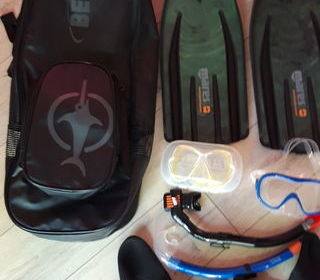 Palmes de plongée de marque de 1 m + étui de transport, chausson de plongée 42/43 , 2 masques, 2 tubas, le tout jamais servi