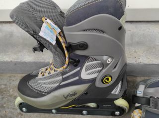 Paire de rollers en ligne T 42 Pour femme poids max 110 kg Dans leur sacoche d'origine NEUFS (cf état des roues) Taille des roues : 76 mm, dureté 76a Livrés avec paire de prot