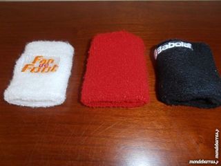 Lot de 3 serre-poignets de couleur différente : - blanc avec inscription orange brodée «Fan de Foot» - rouge uni - noir avec inscription «Babolat»; <strong>Excellent éta