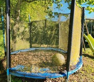 Trampoline d'environ 2m90-3m Ne s'est jamais envolé avec le vent. Stocké sous les arbres, d'où les feuilles et mousse. Prévoir de changer le filet de protection et peut être le