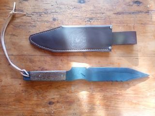 Un couteau idéal pour le bushcraft ou pour la chasse . Lame de 35,4 cm , tranchant de 17,5 cm , trempé et signé, poids 496 gr Son manche est en Ébène vert , étui et drille en cu