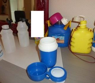 GOURDE / BIDON divers *pour ENFANTS : . mini gourde bleue . bouchon à visser + 1 tasse avec anse . environs 0.25 L . bleue NEWPORT (déco mer,poisson,coquillages) avec anse jau