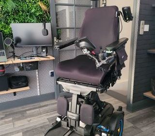 Fauteuil roulant Permobil M3 Corpus lift & inclinaison. 174 kms uniquement. En bon état. Noir avec décors bleus. Caractéristiques : ? 6 roues, giration sur 73 cm en intérie