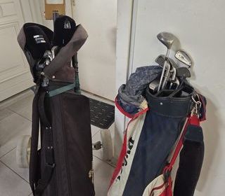 2 SAC DE GOLF . 20 CLUBS 1 CHARIOT AVEC PARAPLUIE HAUSSE PLASTRIQUE 1 PAIRE DE SOULIER GANG ETC . CURIEUR S ABSTENIR . PAIEMENT ET ENLEVEMENT SUR PLACE . ENVOYE MOI VOTRE NO PORTAB
