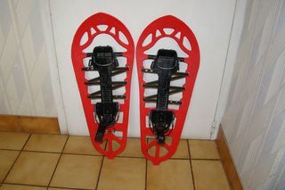 Raquettes à neige de style pattes d'ours avec cadre métallique et sangles. Les fixations sont réglables. Longueur totale : 68 cm Largeur (au plus large) : 23, 2 cm en