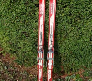 Anciens skis en bois Germina - enfant années 1950 /1960 Skis en bois avec semelles en bois comportant des carres métalliques vissés. Longueur : 122 cm En bon état des trace