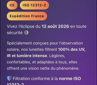 Lot de 1000 lunettes d'éclipse solaire certifiées ISO 12312-2 €" Eclipse du 12 aoà"t 2026 Description Anticipez l'éclipse solaire du 12 aoà"t 2026, un événement majeur qui suscit