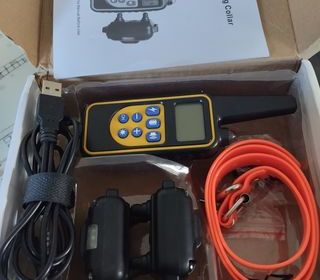 Collier de dressage électronique pour chien vendu dans sa boîte d'origine, complet avec télécommande, câble USB, deux récepteurs, bracelet orange et manuel d'utilisation.