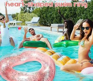 Anneau de natation gonflable en forme de c?ur rose scintillant Taille adulte Idéal pour les fêtes d'été, enterrements de vie de jeune fille (EVJF), mariages, shootings photo à