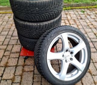 À vendre, un ensemble de quatre pneus d'hiver montés sur jantes en alliage. Bon état général, les jantes présentent quelques marques d'usage mais restent en bon état fonctionnel. L
