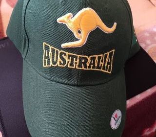 Amateur de Australie affiche ton style avec cette casqutte verte arborant un Kangourou Jaune et le mot Australia brodé en lettre dorée . Model original , occasion en bon état ,