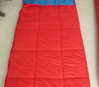 A vendre sac de couchage une personne rouge et bleu en très bon état fermeture éclair avec sa housse de protection en plastique .