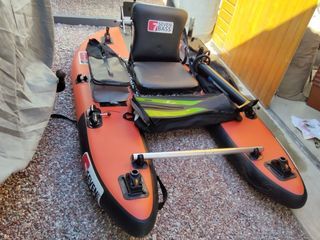 Vends float tube Jungle operator Flex de Steven Bass, 2, 40m de long, 1, 22m de large. Poids 24kg. On peut pêcher debout ou assis car il y a un siège très pratique. Vendu complet