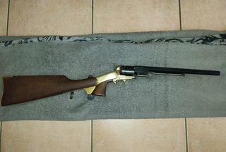 Colt navy en calibre 44 (poudre noire) avec sa crosse amovible et son canon de 30cm en très bon état. Fabrication GAMI Bronzage à 95%. Carcasse en laiton. Quelques anciennes