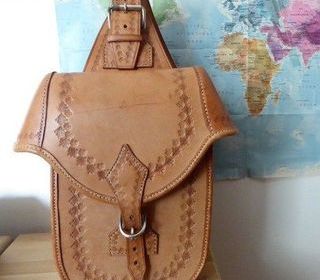 Article d'exception, sacoches de randonnée équestre en cuir gauchos (ep. 5mm) décorée rosace au poinçon H 37cm l 33cm (24cm pour le contenant) ep. 10 cm. Acheté au Chili en 2