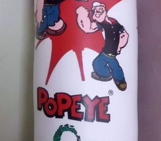 sac de frappe en simili cuir blanc imprime popeye et brutus 50 cm marque duarig annee 1998 j'ai mis bon etat petit accroc sur le bas du sac mais le sac de frappe reste en bon etat