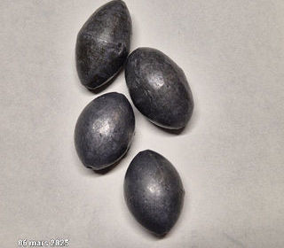 Lot de 4 gros plombs de forme olive, poids différents 3 plombs de 72 grs. et 1 plomb de 85 grs. Vendu en lot pour tous types de flotteurs carnassiers