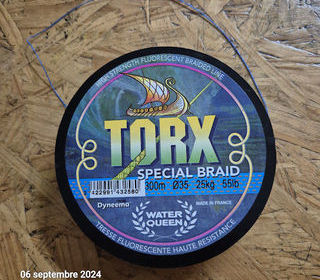 TORX tresse bleue et noire neuve de 300 m 35/100 25kg spécial braid Marque : Water Queen Etat de l'objet : Neuf Type de fil : Tresse Diamètre du fil : 31/100 au