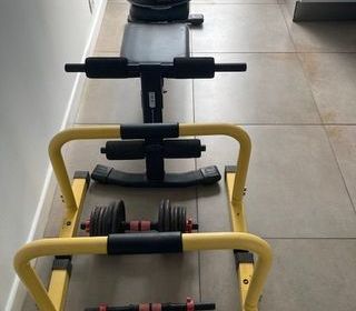 vends banc de musculation complet multi position avec 2 barres de dips 1 paire d haltere de 16kg et une ceinture lombaire 40 euros le tout remise en main propre uniquement