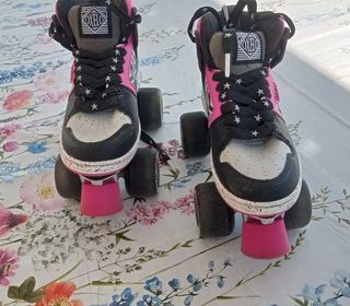 Patins à roulettes de marque OXELO avec 3 sets de protection (6 à 10 ans ? de 25 à 50 kgs) Très peu utilisé