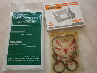 lot de survie neuf comprenant - une couverture de survie isothermique 220*140 cm - ensemble de réchauffage ( 1 réchaud,1 pince, 6 pastilles de combustibles, 1 boite d'allumette