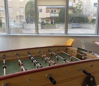 Table de baby-foot en bois avec joueurs peints en bleu et rouge. Équipée de plusieurs manettes noires et d'une zone de récupération de balles. En bon état général, cette table est