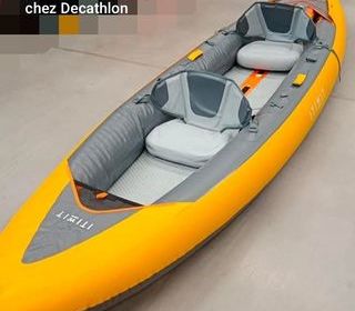 Kayak gonflable biplace de couleur jaune et gris, équipé de deux sièges amovibles avec dossier, adapté pour deux personnes. L'ensemble est en bon état général, avec tous les access
