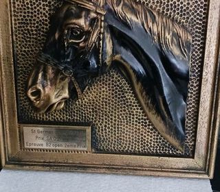 Trophée ? de course chevaux équitation 2 ème prix à st germer de fly prix sa quintana épreuve b2 open. Tête de cheval métal patine bronze un magnifique cadre poids 1k574 24×24 cm