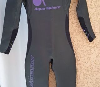 Combinaison nage et longe-côte noire avec un peu de mauve, marque Aqua-Sphère, épaisseur 3 mm, taille médium, en 90% de néoprène et 10% de nylon, juste à bien rincer à l'eau claire