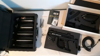 Bt 4 Delta avec: Caisse bois avec mousse d'origine pour protéger et transporter le lanceur. 2 bouteilles air et 3 bouteilles co2, dans valise protection avec mousse. 1 fle