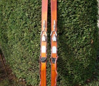 Anciens skis en bois Trixylo - années 1940 avec ses cales de fixation en bois. fabricant : Etablissements Michel Made in France Longueur des skis : 195 cm En bon état A