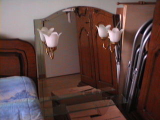 Miroir en forme de chapeau de Gendarme avec 2 spots intégrés + 1 petite tablette en verre. Miroir: hauteur: 1m / largeur: 70 cm. Tablette: longueur: 70 cm. / largeur: 9,5 cm. Fi