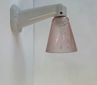 Belle applique en céramique avec son abat-jour Art-Déco à motifs. En bel état général. Quelques traces du temps. Electricité refaite. Branchement par domino. Douille à baïonnette